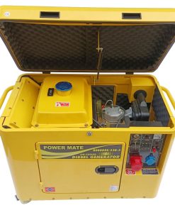 Power Mate 8000 dieselaggregat 3 fase 230V. Dieseldrevet støydempet strømaggregat for profesjonelt bruk. Aggregatet leveres med selvstart, batteri og 1 x 1 fase uttak og ett 3 fase uttak .Motor og generator er sammenbygd til en enhet som er montert i en vibrasjonsfri ramme med støydemping.Aggregatet har lav olje, stopp – startsperre som en sikkerhet.Løftekrok, bærehåndtak og 4 hjul, gjør aggregatet lett og flytte.Lang driftstid på en tankfylling. Aggregatet er ikke for maritimt bruk.