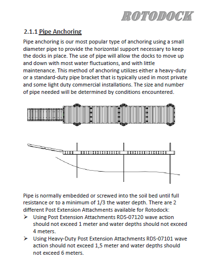 Rørforankring er vår mest populære type forankring Rotodock med et 3″ rør for å gi den horisontale støtten som trengs for å holde dokkingstasjonene på plass. Bruk av rør gjør at dokkene kan bevege seg opp og ned med de fleste vannsvingninger, og med lite vedlikehold.