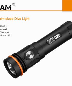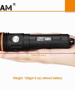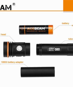 Acebeam D20 er bygget for dykkere som krever lommelykt som kan operere i dybder opptil 200 meter, men kan også brukes til utendørs aktiviteter/arbeid. D20 lommelykten kan konkurrere med det beste av det beste på land eller under vann, noe som gjør den til en virkelig allsidig lommelykt!