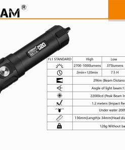 - Maks 2700 lumen drevet med 1 x 21700 oppladbart batteri