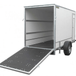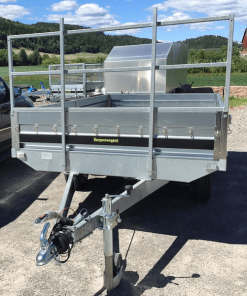 Knott akslinger med brems. Forsterket nesehjul 60 mm. Delte sidekarmer. Frontgrind. Innvendige kraftige surrekroker.