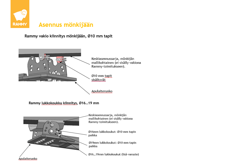 Rammy løftes med ATV vinsj. Roterende beitepusser festes til ATV med to låsepinner til sentermonteringssettet på samme måte som snøplate (sentermonteringssett, bak foraksel under ATV).
